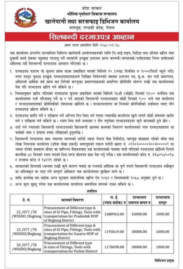 © सर्वाधिकार सुरक्षित खानेपानी तथा सरसफाइ डिभिजन कार्यालय, बाग्लुङ्ग